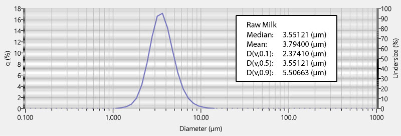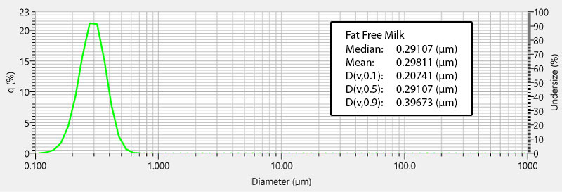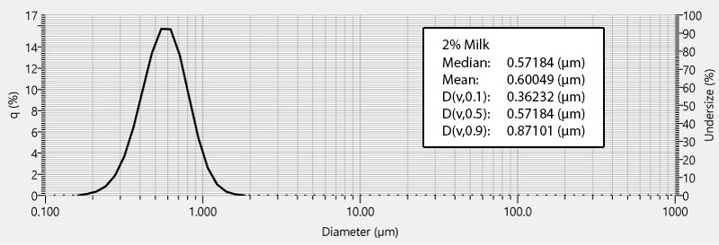 지방의 많은 부분이 제거된 2% 우유에서 주요 피크는 1마이크론 주위의 중심을 유지하는 반면 작은 쪽에는 약간의 숄더가 나타납니다. 이것은 지방구의 제거로 인해 분포에 나타나는 카제인을 나타냅니다.