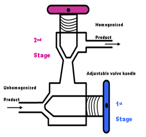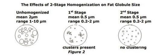대부분의 지방구 감소는 첫 번째 단계에서 이루어지지만 감소된 지방구가 뭉치거나 뭉치는 경향이 있습니다. 그림 1에 표시된 두 번째 단계 밸브를 사용하면 아래 그림 2에서 볼 수 있는 것처럼 이러한 클러스터를 개별 지방 덩어리로 분리할 수 있습니다. 두 번째 단계는 위의 다이어그램에서 볼 수 있듯이 첫 번째 단계와 유사합니다. 2단계 균질화기는 균질화 과정을 정밀하게 제어할 수 있습니다. 다른 밸브 설정은 다른 크기의 에멀젼을 제공하며, 이는 차례로 최종 제품의 안정성, 맛 및 저장 수명에 영향을 미칩니다.